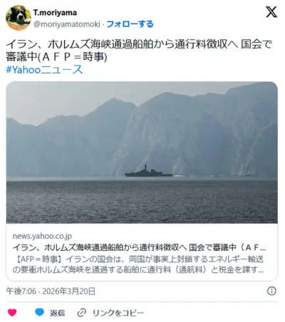 イラン、ホルムズ海峡通過船舶から通行料徴収へ 国会で審議中⋯報道