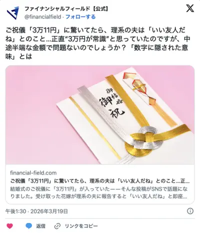 ご祝儀「3万11円」に驚いてたら、理系の夫は「いい友人だね」とのこと… (ファイナンシャルフィールド)