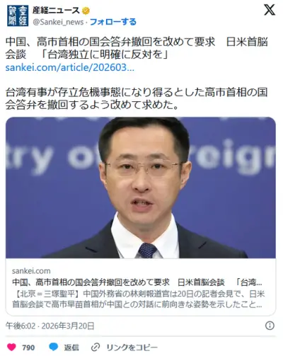 中国、高市首相の国会答弁撤回を改めて要求 日米首脳会談 「台湾独立に明確に反対を」