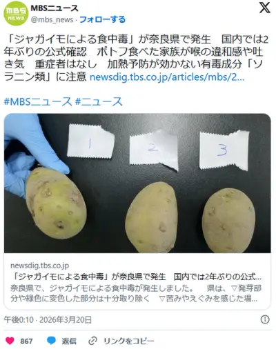 「ジャガイモによる食中毒」国内では2年ぶり ポトフ食べた家族が喉の違和感や吐き気 加熱予防が効かない有毒成分「ソラニン類」に注意
