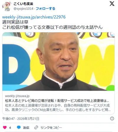 松本人志 CMでの地上派復帰で各テレビ局から出演オファー殺到 松本とテレビ局の立場が逆転!
