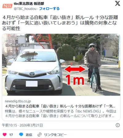 【道交法】4月から始まる自転車「追い抜き」新ルール 十分な距離あけず「一気に追い抜いてしまおう」は摘発の対象となる可能性