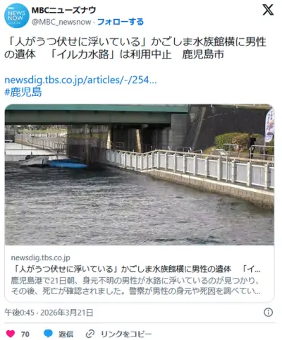 【鹿児島】「人がうつ伏せに浮いている」かごしま水族館横に男性の遺体 「イルカ水路」は利用中止 鹿児島市