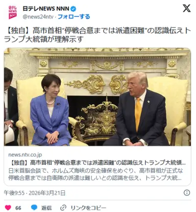 【速報】高市早苗「憲法9条があるので停戦合意まで自衛隊派遣はできない」トランプ「わかった」