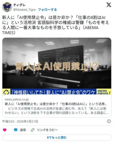 「新人はAI使用禁止」令は是か非か? …言語脳科学の権威は警鐘「ものを考える人間に一番大事なものを手放している」