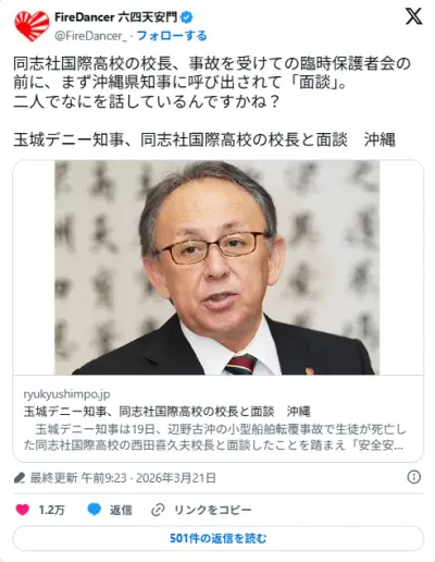 玉城デニー知事、同志社国際高校の校長と臨時保護者会の前に面談。何を話しているんですかね