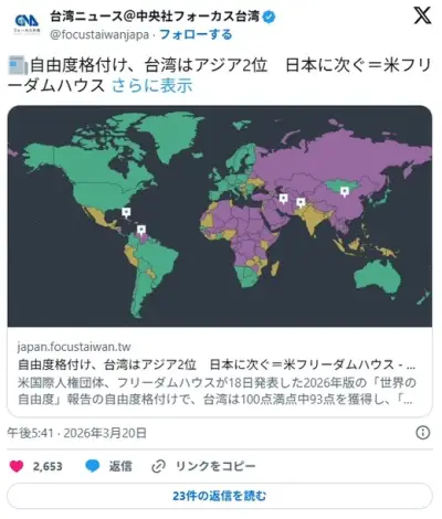 自由度の格付け、日本は100点満点中96点 台湾93点 ロシア12点 イラン10点 中国9点 北朝鮮3点