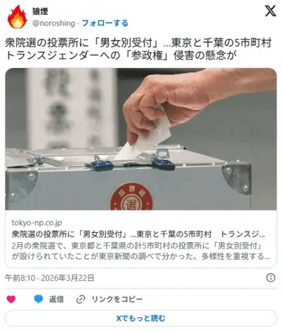 衆院選の投票所に「男女別受付」…東京千葉5市町村 トランスジェンダーへの「参政権」侵害の懸念
