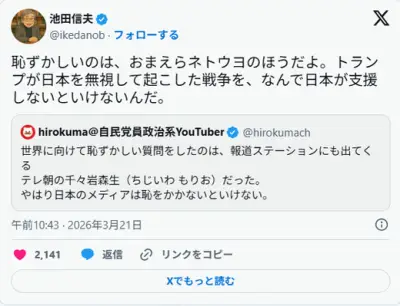 池田信夫『恥ずかしいのは、おまえらネトウヨのほうだ。トランプが起こした戦争をなんで日本が支援』