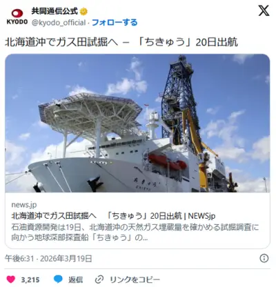日本、北海道の沖合50kmに天然ガスの存在確認 日本の国産資源としてガス田試掘へ「大きなポテンシャルを秘めている」