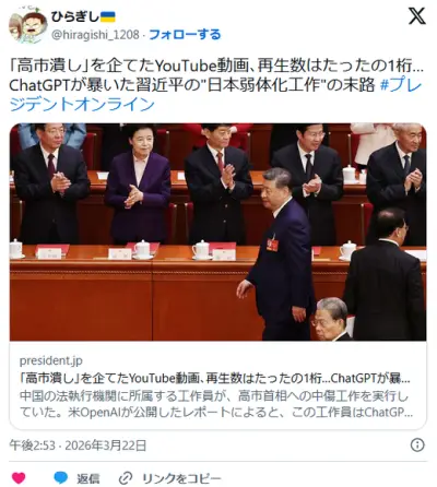 「高市潰し」を企てたYouTube動画、再生数はたったの1桁…ChatGPTが暴いた習近平の"日本弱体化工作"の末路