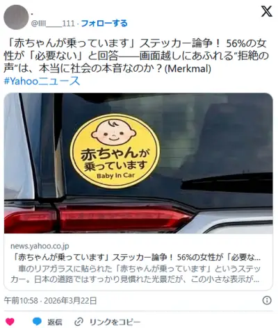 「赤ちゃんが乗っています」車のステッカー、SNSで拒絶の声「だから何?」56%の女性が「必要ない」と回答