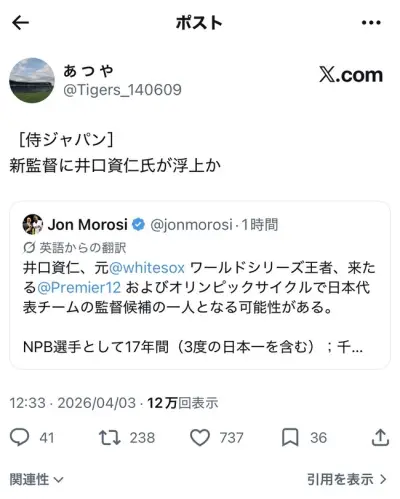 侍ジャパン新監督、井口資仁浮上wwwwwww
