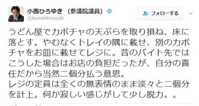 立憲議員「うどん屋で天ぷらを床に落とす。レジで無表情のまま淡々と2個分を計上されて脱力」