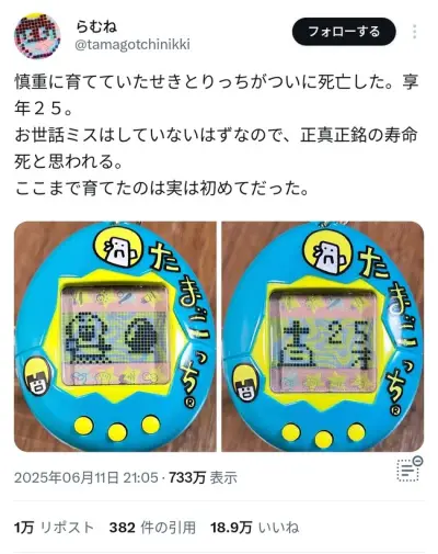 X民「たまごっちを大事に育てて25年、とうとう死にました」→24万いいね