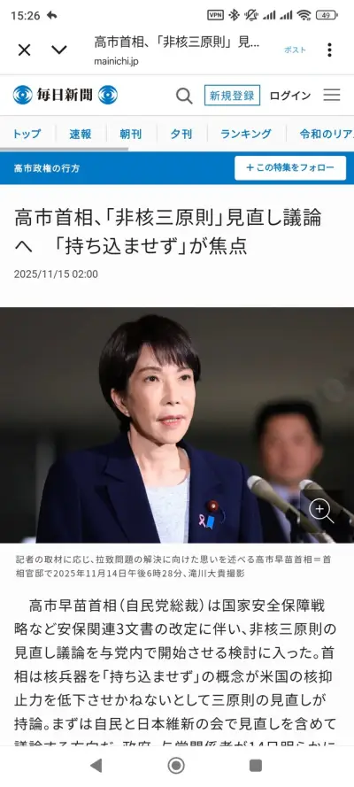 【悲報】俺達の高市早苗、このタイミングで非核三原則見直しを打ち出し中国を激怒させる
