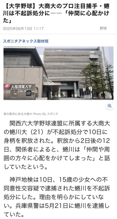 【朗報】ドラフト候補大商大蜷川、不起訴