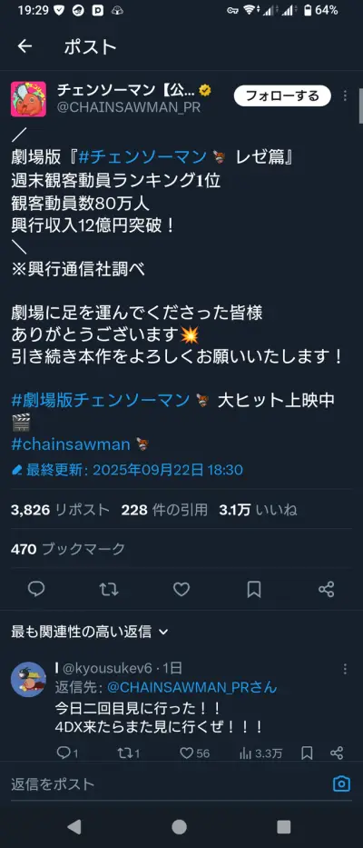 なんG民「チェンソーマンレゼ編は20億行けばいい方」「平日公開はアホ」「着座率低いからステマ」