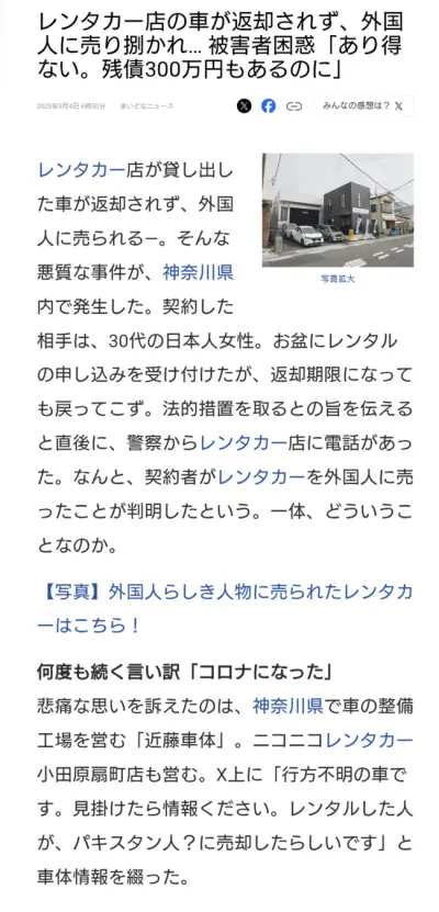 【悲報】女さん、借りたレンタカーを外国人に売ってしまう