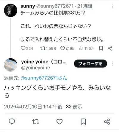 【悲報】れいわ信者「チームみらいはハッキングでれいわの票を奪った」
