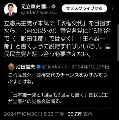国民民主議員さん「本気で政権交代する気なら首班指名は野田ではなく玉木と書け」