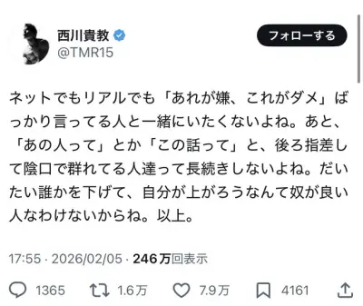 【悲報】西川貴教「なんG民みたいな奴と一緒にいても楽しくないし関係も長続きしない。」