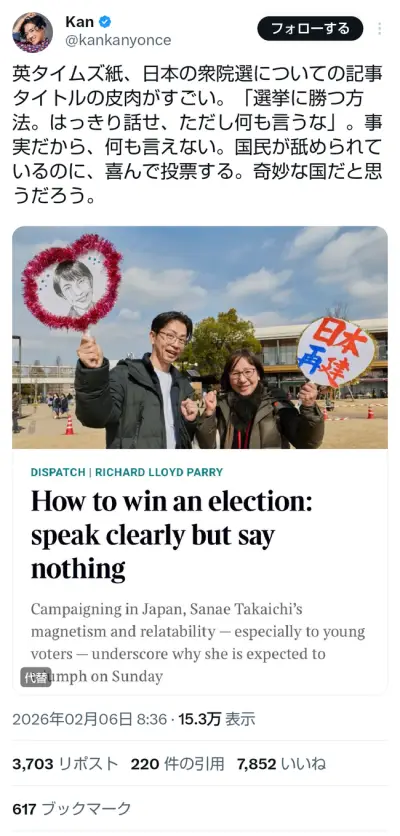 【悲報】英タイムズ「日本の選挙で勝つ方法。はっきり話せ。ただし何も言うな」