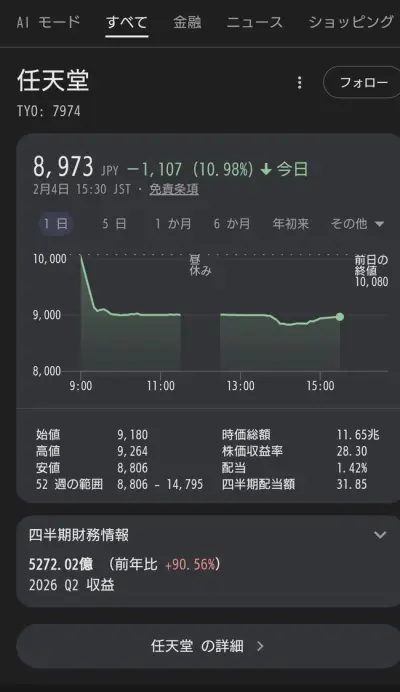【悲報】任天堂の株価、ヤバすぎる