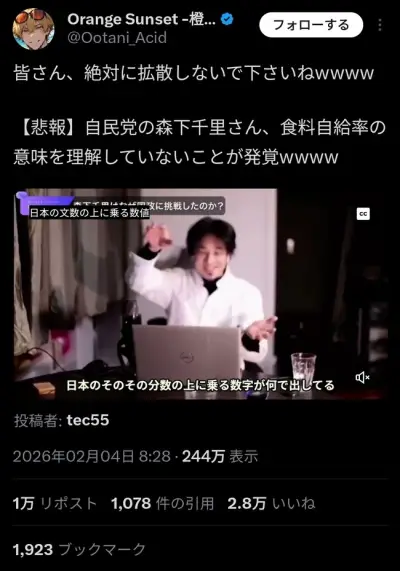 【悲報】自民党の森下千里さん、食料自給率の意味を理解していないことが発覚www