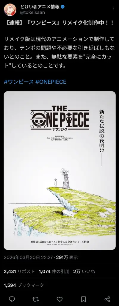 【悲報】リメイク版ワンピース、東映の無駄な引き延ばしは完全削除される模様