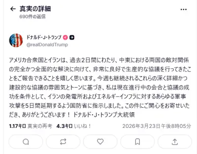 イラン戦争ガチで終戦へ!トランプ「イランと終戦に向けて協議した」