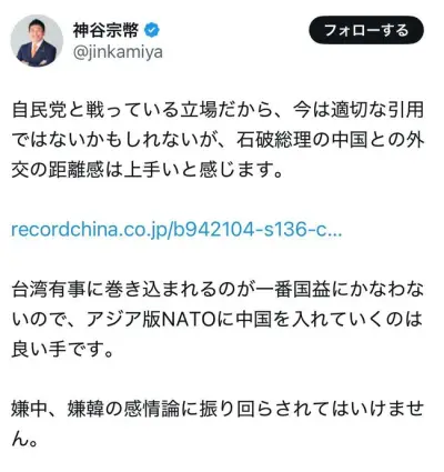 【朗報】参政党神谷さん「石破さんの対中外交は上手い。嫌中の感情論に振り回されてはいけない」