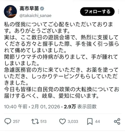 高市早苗「テーピングをしたので午後の演説はします!!!!」