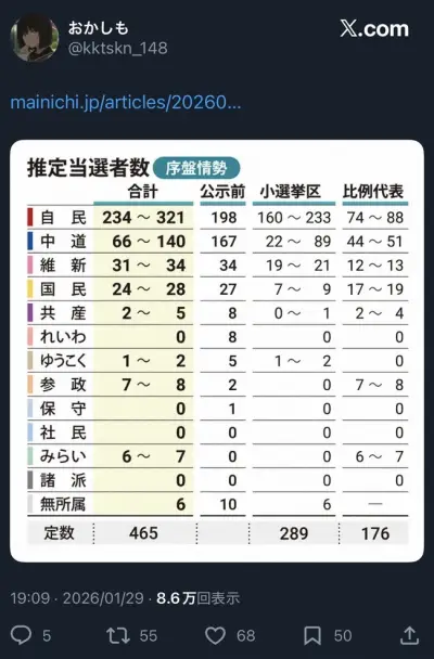 【速報】自民党、321議席獲得で単独3分の2以上確定wwwwwwwwwwwwww