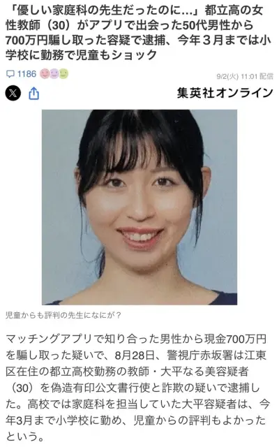 【画像】美人女教師さん、パパ活おぢから700万騙し取り逮捕
