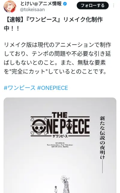 【朗報】ワンピースリメイク、原作や東映版のテンポの問題を改善して無駄な要素を完全にカットする模様