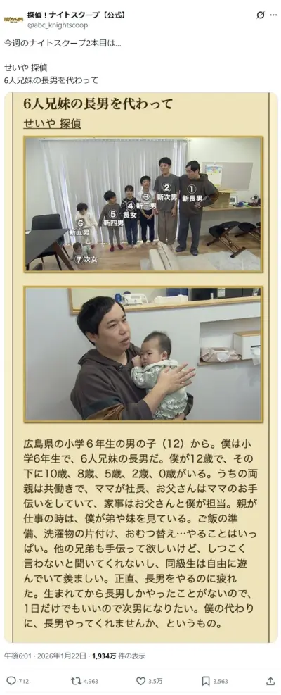 探偵!ナイトスクープが波紋、小学生に長男にすべてを押し付ける親
