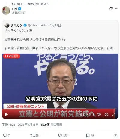 中革連さん堂々宣言「公明党が立憲を吸収しました。合併ではありません」