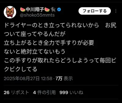 【画像】中川翔子さん、腹が大きくなりすぎて手すりがないと立てなくなってしまう