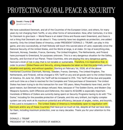 トランプ「米国のグリーンランド占領に反対する国には関税追加で25%な」