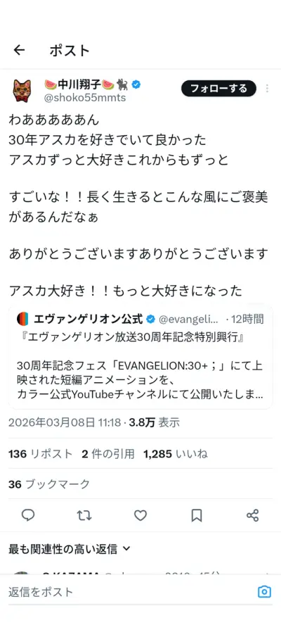 中川翔子「わああああん 30年アスカ好きでよかった」