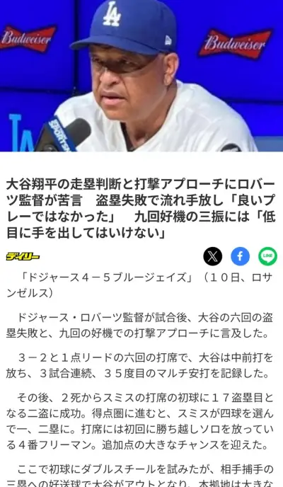 ドジャース監督、『2アウト1、2塁。打者フリーマンで3盗失敗』の大谷翔平に「良い判断とは言えない」