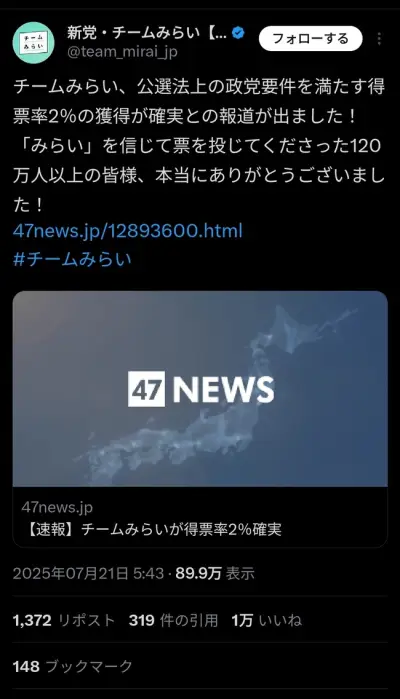 チームみらい!得票率2%で国政政党要件を確保!!!!!!!!!!!