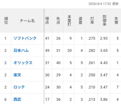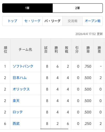 【朗報】パ・リーグ、2位が4チーム
