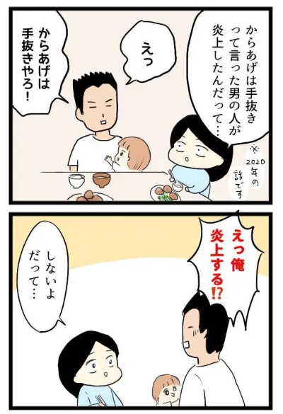 【悲報】妻「からあげは手抜きって言った男の人が炎上したんだって」夫「えっからあげは手抜きやろw」