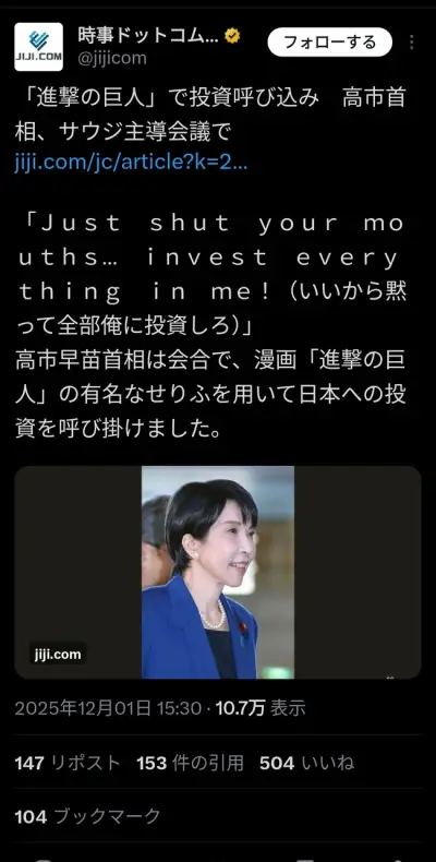 【悲報】高市早苗、進撃の巨人を政治利用wwwwwwww