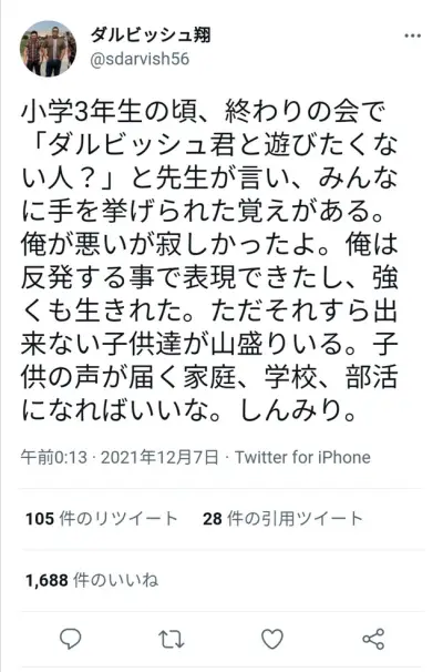 【悲報】ダルビッシュ「『ダルビッシュ君と遊びたくない人?』と先生が言い、みんなに手を挙げられた」