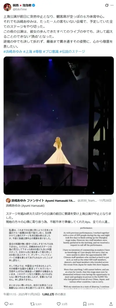 浜崎あゆみさん、無観客で中国公演をやり切った模様www