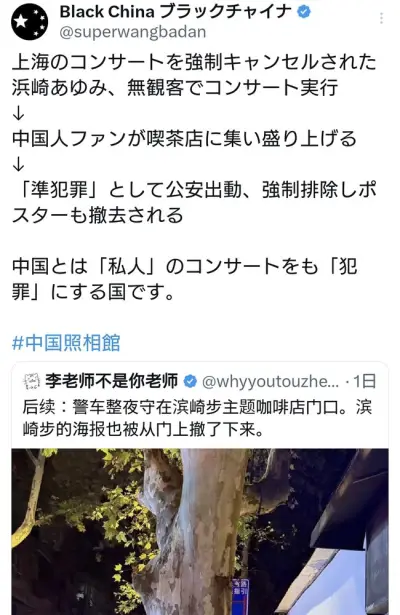 【悲報】浜崎あゆみの中国人ファンが喫茶店に集い盛り上げるも公安が出動し強制排除しポスターも撤去
