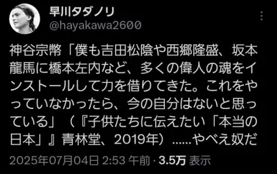 【悲報】参政党・神谷代表「僕は吉田松陰や西郷隆盛、坂本龍馬等の偉人の魂をインストールしてる」